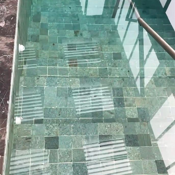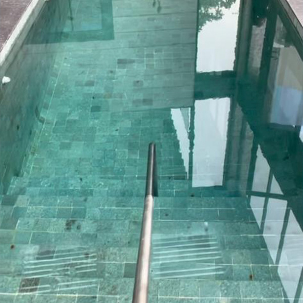 Recubrimiento de piedra Sacabumi para alberca interior.Acabado: Sacabumi